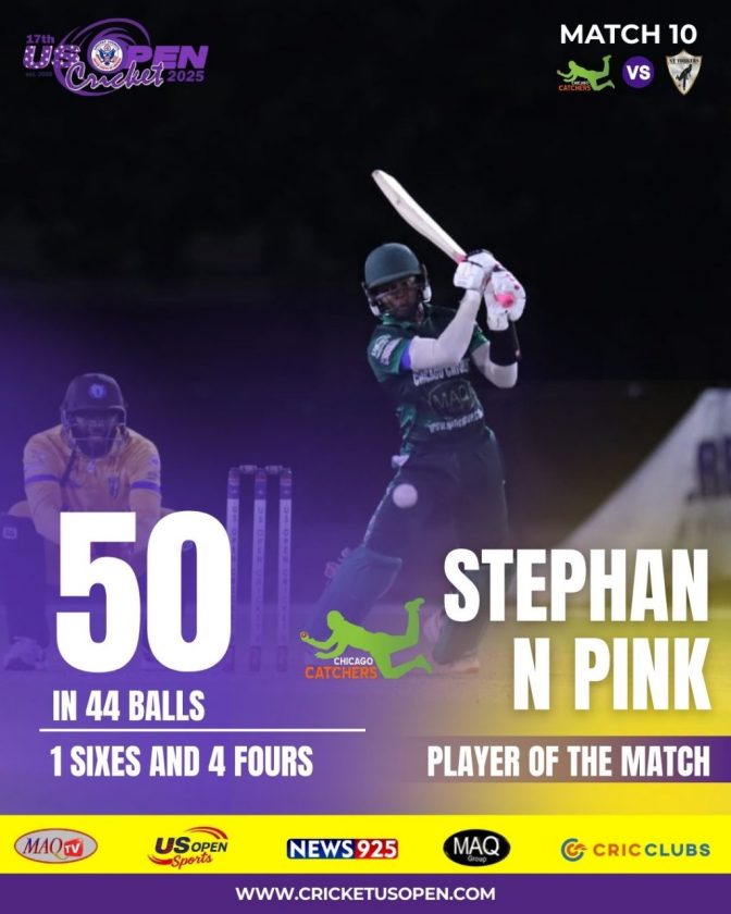 For his match-defining half-century, Stephan Nicholas Pink was deservedly named Player of the Match, playing a key role in Chicago Catchers’ hard-fought win.