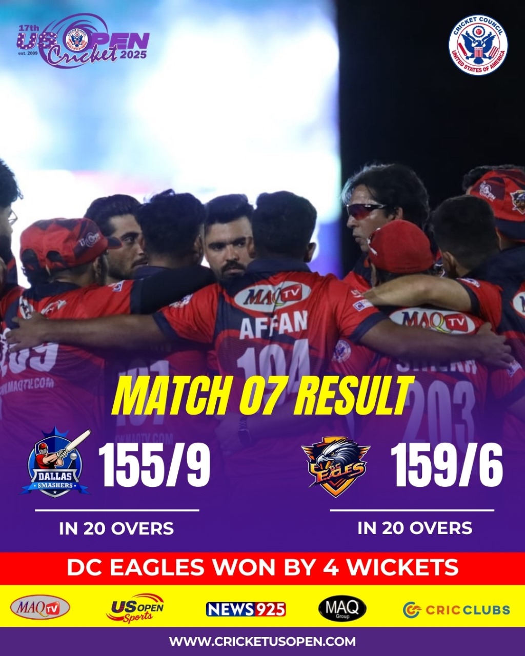 The DC Eagles registered a thrilling 4-wicket victory over the Dallas Smashers in the US OPEN Premier Cricket League 2025, chasing down a competitive target in a tense finish.