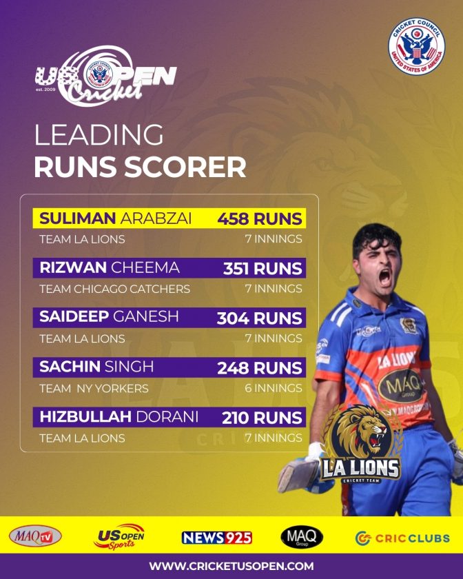 • Most Runs: Suliman Arabzai (LA Lions) – 458 runs