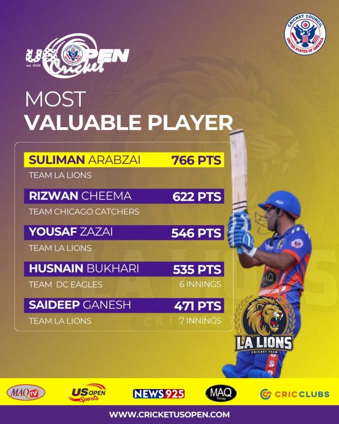• MVP of the Tournament: Suliman Arabzai (LA Lions)
